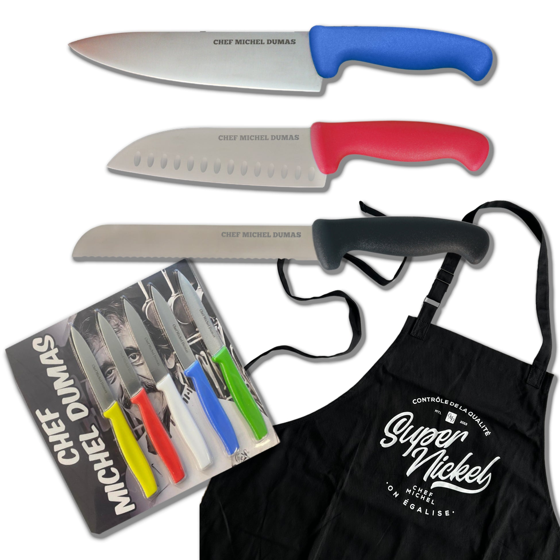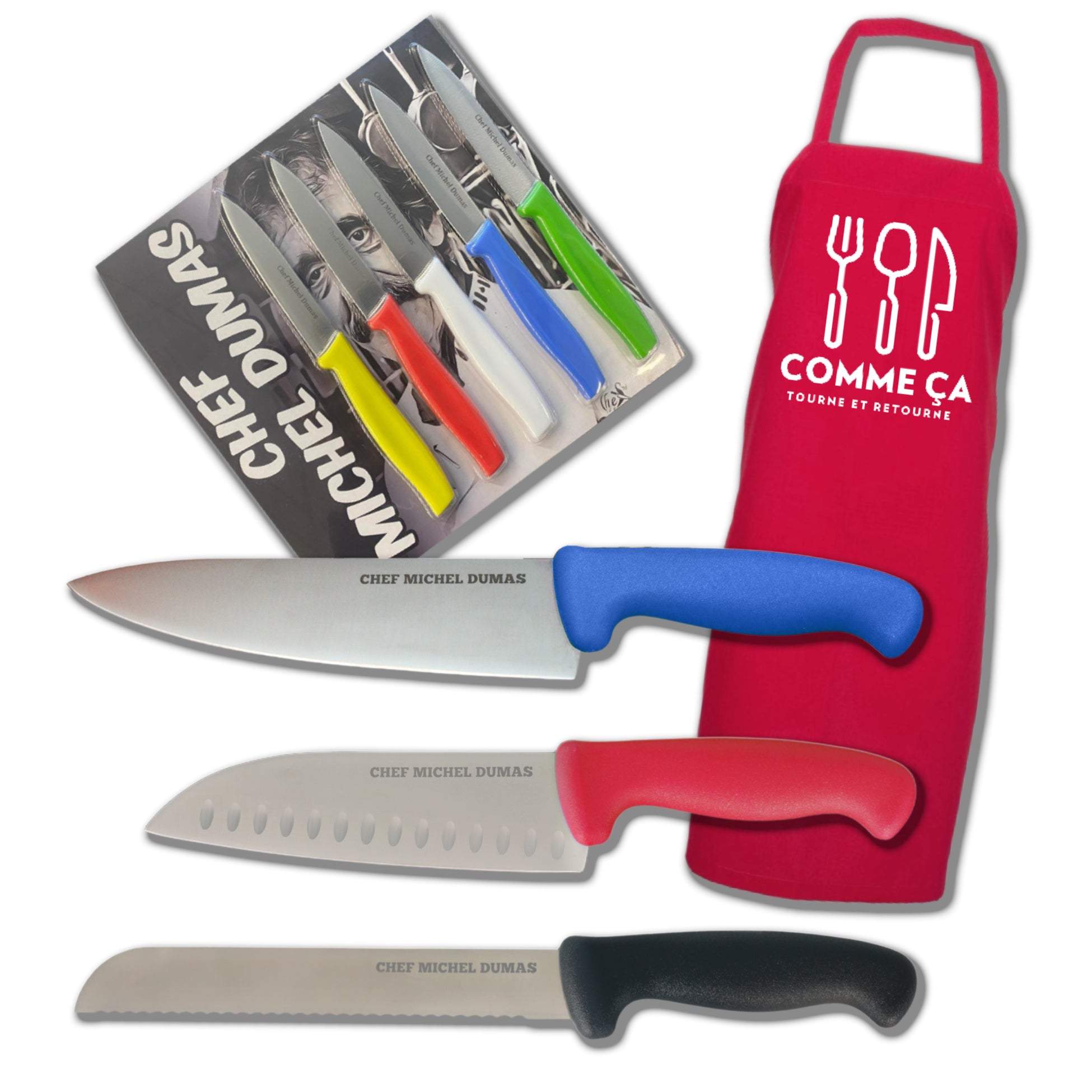 Notre Ensemble de Noël Édition Limitée réunit nos couteaux en acier allemand, notre ensemble de couteaux d’office colorés, ainsi que nos tabliers emblématiques, dont les tabliers rouges signés à la main à “La Table 55” par le Chef Michel Dumas.